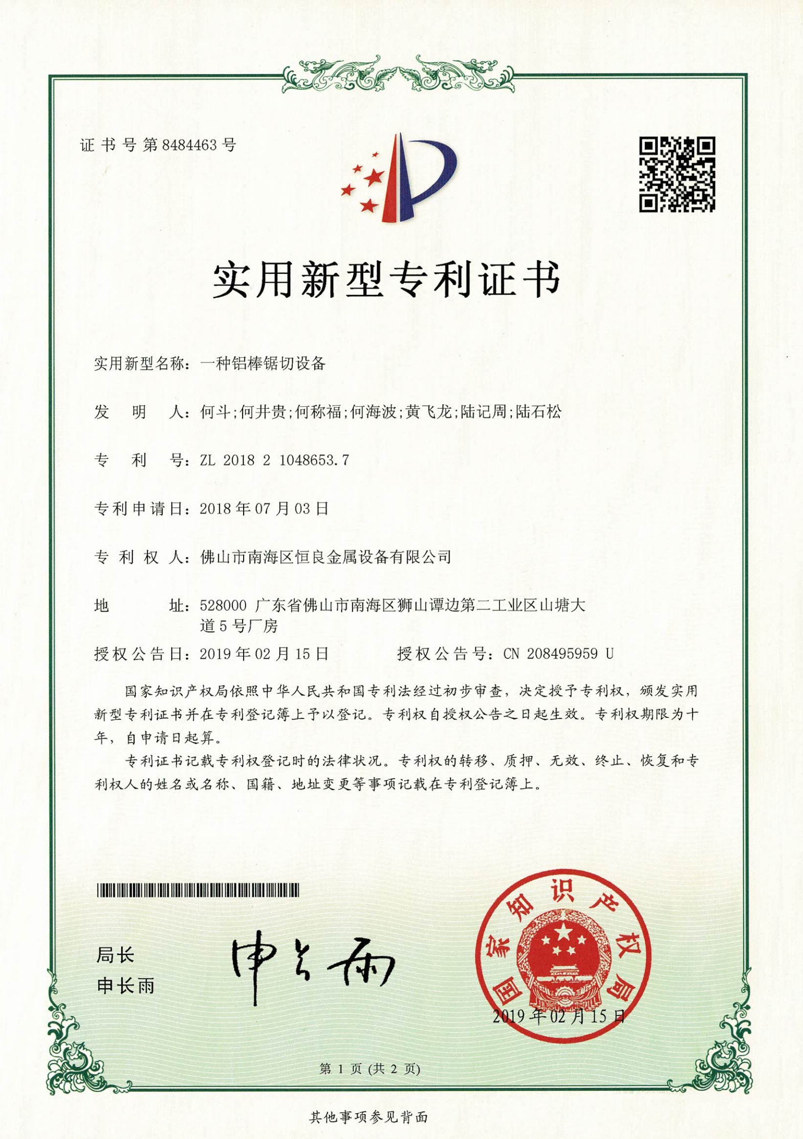 应用于铝棒锯切设备上的自动锯切机构专利证书