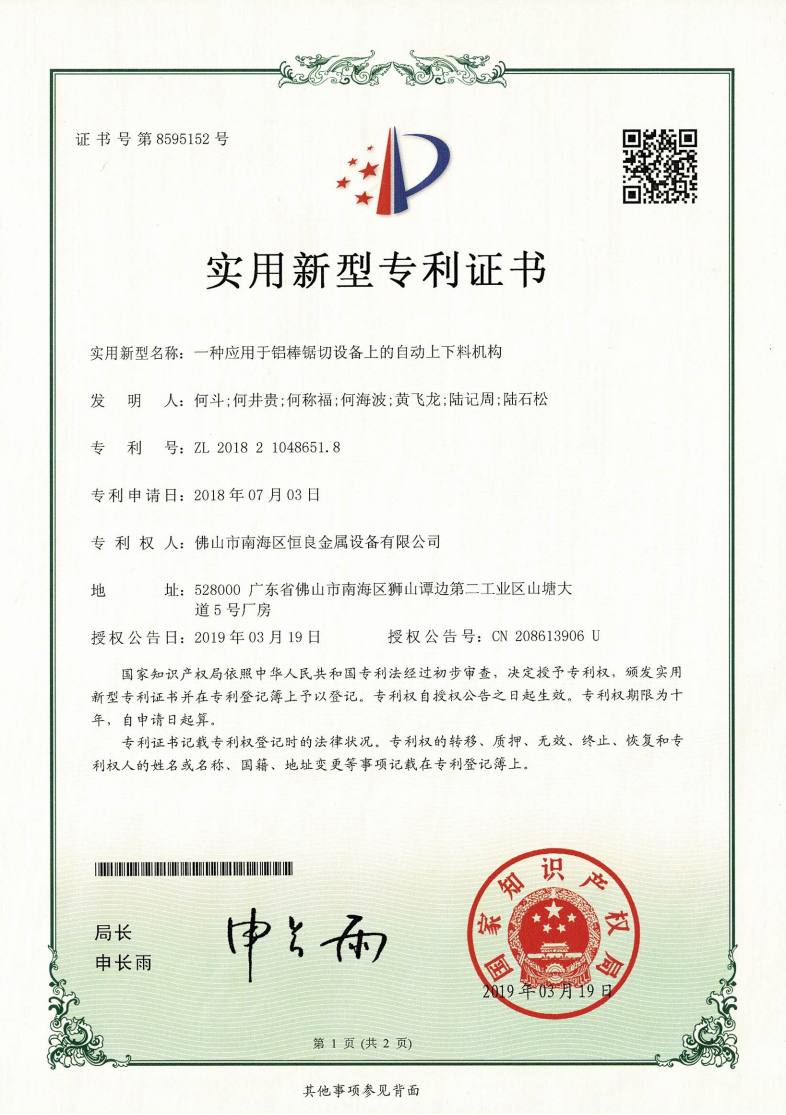 应用于铝棒锯设备上的自动上下料机构专利证书